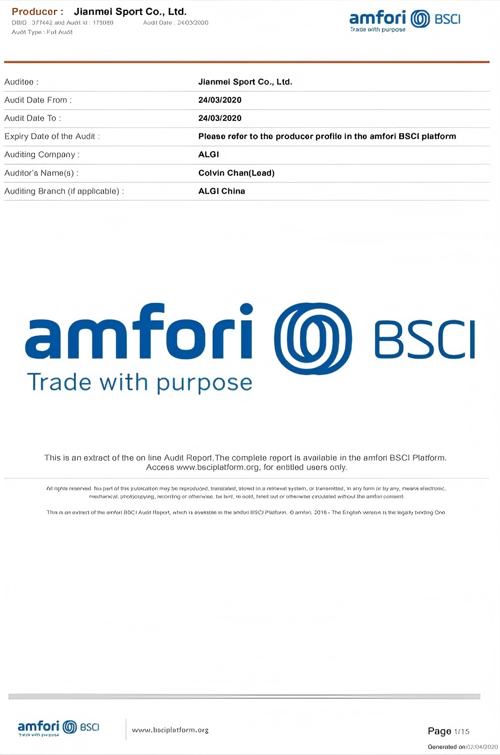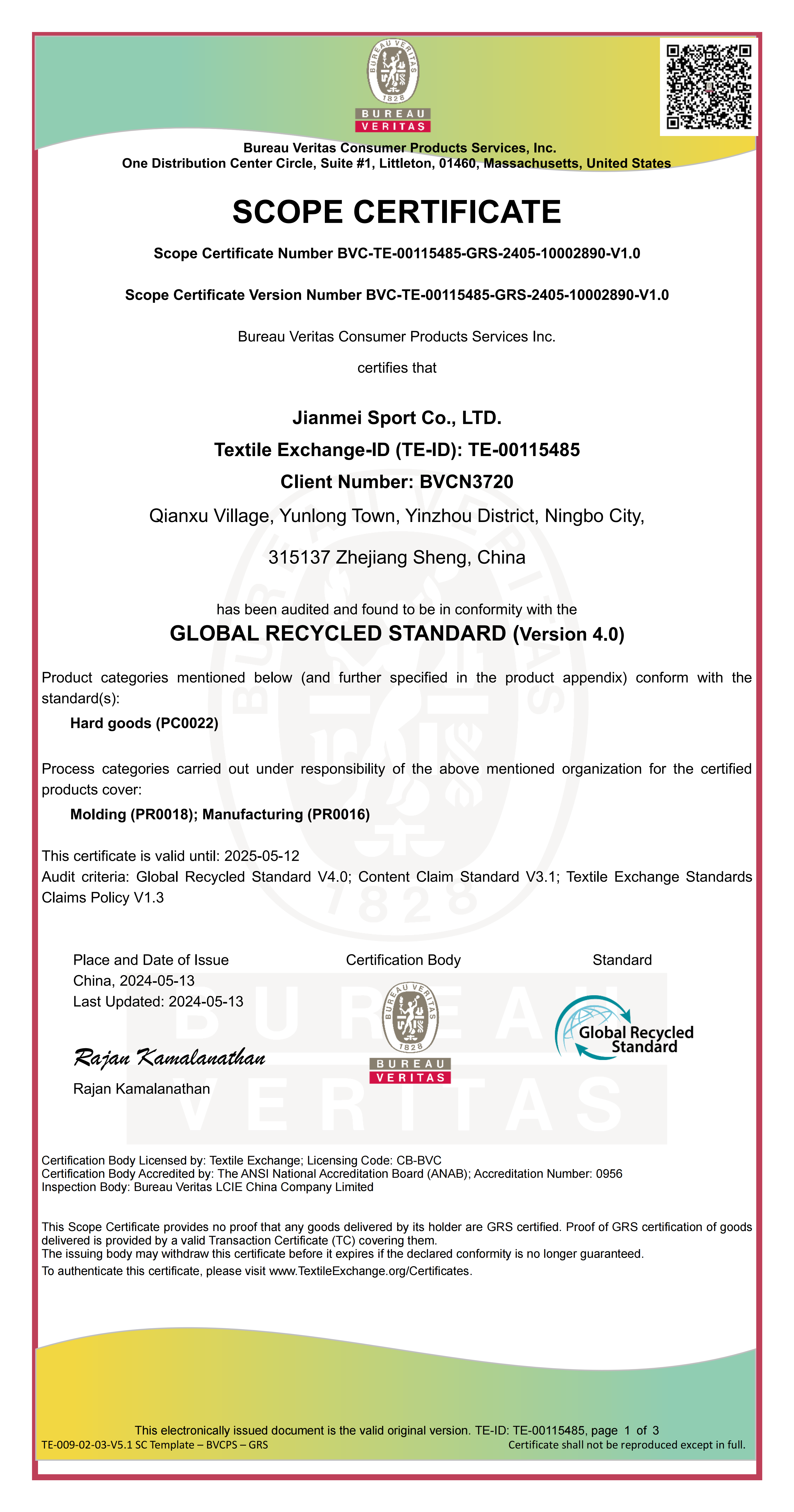 Scansione da visitare| Nome certificato: | GLOBAL RECYCLED STANDARD (Version 4.0) |